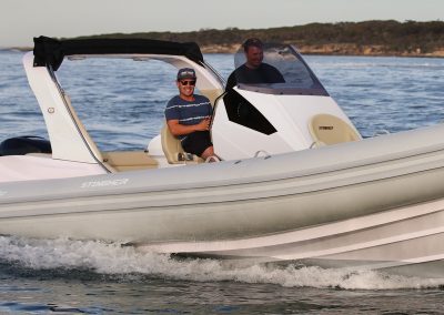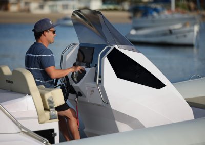Revêtement en teck synthétique complet (passerelles supra-tubulaires, poste de pilotage du moteur, plate-forme de la console, passages interne, ancre de porte, plates-formes de poupe et rouleau d’étrave)